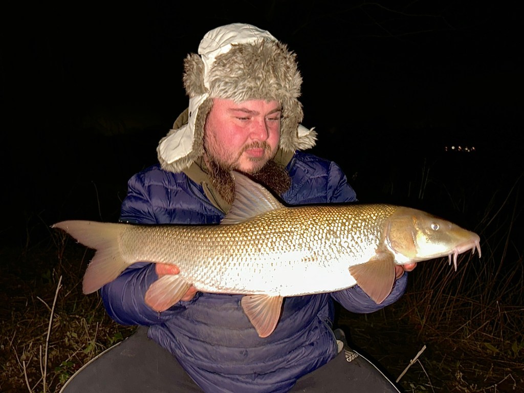 The beginning of the following week, we had incredible mild conditions with a low pressure system moving in and night time air temperatures saying at 9 degrees for two days in a row, this to me screamed an opportunity for a winter Barbel, with the rain lifting my Local Yorkshire River Derwent by a healthy 2 foot it had to be worth a visit after work and a nice catch up with my mate Chris. I got down to the river about 7pm giving me a few hours to get a bite. I opted to fish simple a nice lump of my homemade Boilie paste and a small bag of crumbed matching boiles on a 5oz lead. Half way across the river you could see a nice flat smooth like glass run. This signals to me that the bottom is nice and uniformed depth most probably a gravel run. Chris was slightly down stream of me and he opted to fish a big bunch of Lob Worms a deadly method down there especially in the current conditions. Chris was first off the mark with a tiny barbel about a pound in weight, perfection in miniature and a good indicator that the river is healthy. Time was ticking away for me but bang on 10pm my rod burst in to life and I was hooked in to the target species. It gave me a right battle on my braided mainline feeling every lunge all the way back to the net, once safe in the mesh of the net she was allowed to rest while I sorted out the mat sling and scales. It looked a decent fish especially for this river and once lifted the needle was just flickering under 9lb 1oz, to most anglers and rivers 9lb isn’t a big fish but on the Yorkshire Derwent that is a proper one. Over the years I’ve managed a few low doubles from the area but I would still regard this fish a real specimen for the river. The pictures didn’t come out to clever with a lot of glare and reflection from the IPhone flash but with a January Barbel I was more than happy.