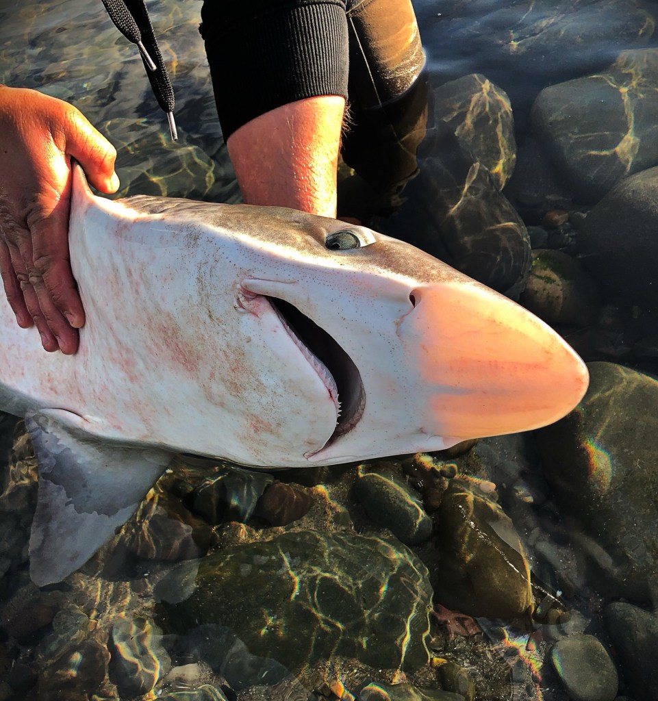I quickly unclipped the rig and sent Chris back to the tripod with the rod and to bring our big weigh sling down. Once the fish was safe in the sling we carried her up to an unhooking mat at the top of the beach where it was level and set about unhooking and weighing this mini Great White, to say it was only just hooked through a small bit of skin at the edge of its mouth it was still a forcepts job to get it out. It was at this point I realised both Mitzi and Chris were scared of this apex predator. We got it lifted up on the zeroed Reuben’s and after the needle had done one complete revolution decided to settle on 38lb, what a creature I was definitely more than happy with that result and especially so early in the day. Some brilliant pictures were quickly taken and back she went, I held her in the edge for a good 5 minutes before she decided it was time to go and just watched in ore as she swam off in the crystal clear Scottish waters