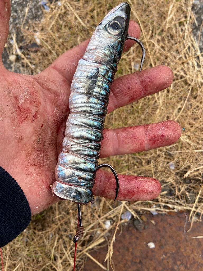The weather running up to this trip had been settled for a good 3 days prior and the lads on the boats had been catching well from the reports we had seen with a lot of Mackerel shoals present in the bay, things were coming together nicely. Personally I think it pays to pick your windows of opportunity and try and go at the drop of a hat rather than just setting a date and sticking to it regardless. It was fast approaching low water now so we didn’t waste any more time getting back to the van for the gear and set up base on the pebble beach, not knowing of anywhere close to hand on our first visit that could guarantee us catching a bucket of fresh Mackerel I opted to order some earlier in the week from a local fishmonger I used to work for years ago. An expensive option I know but expensive bait is better than no bait and we were here to fish for Tope, the bait was extremely fresh coming from a day boat landed at brixham arriving at the fishmonger Friday morning after traveling on the overnight transport and my Wife saved the day collecting them whilst I was at work. My set up was pretty straight forward the big boy rods came out to play, a Pair of Century T1000’s fished with braid on a fixed spool reels, long pulley rigs with a bite trace of 90lb wire. Baited up with fairly decent offerings of fresh Mackerel and cast out as far as possible, with the size of the baits this was probably about 120-130yards these gave off an incredible slick on the surface from the fresh oils and blood from the bait.