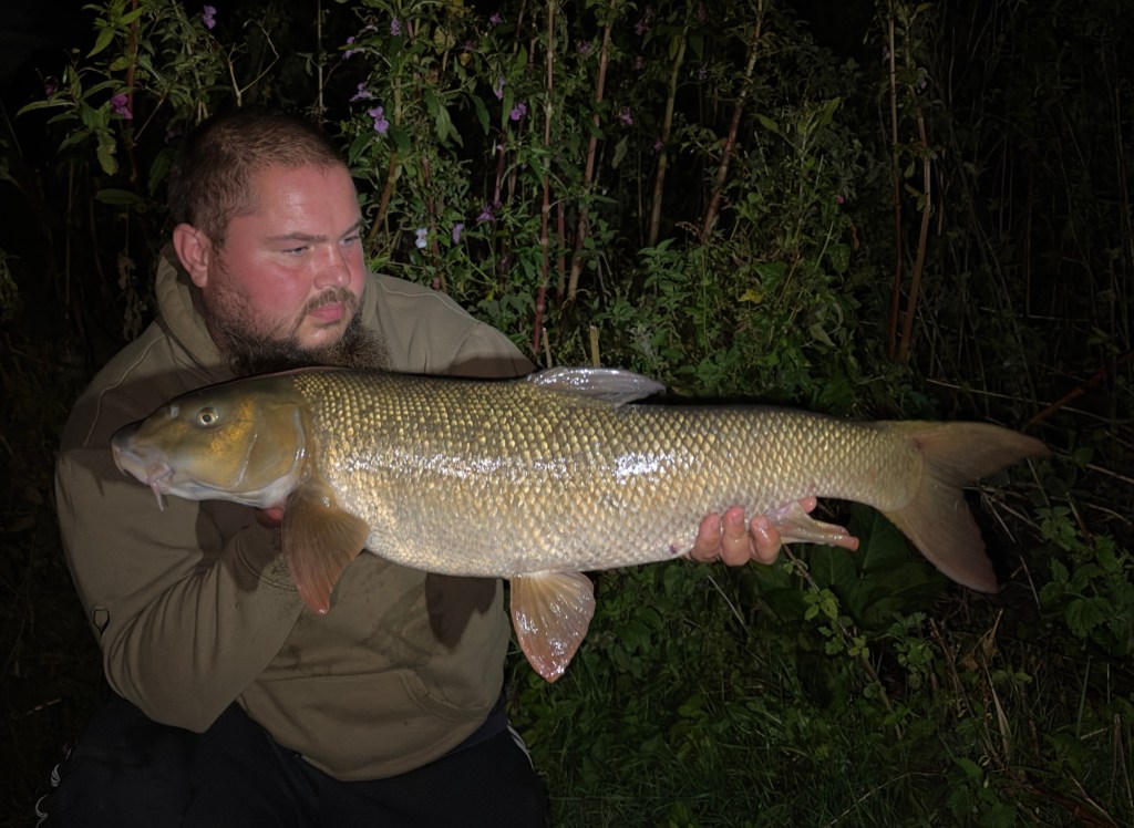 Speaking to a few of the club members on the stretch they all seemed to mention to big elusive barbel that resided here, this is what they had been targeting. All the time I’d been Chub fishing I kept hearing big fish roll out in the dark, thinking these were either big Barbel or big Trent Carp I always put a few baits over them when I packe up just priming them incase the situation arose. The following week I decided to have a go for the Barbel, those that know me know I don’t often fish for them as fish like Chub, Roach and Perch tend to get my attention, more traditional fish. But on this night I thought I’d have a go seen as the rumours of such big fish were worth investigating. Like clockwork about 8pm I started to hear big fish roll then another, I thought to myself if one more rolls I’ll pack the Chub gear away this didn’t take long and a third roll in 20mins in the same area sealed the deal. Again simple tactics were employed single boile on the hair and a little bag of 2 squashed and two whole baits in a small Pva mesh bag attached to the lead and fished about 10yards upstream of the shows, this was followed by about five free offerings catapulted in the immediate area. With the trap set it was time to sit on my hands and wait, it didn’t take long as about 90 minutes later the tip dropped a fish had dislodged the lead. I wound down in to the fish and the fight commenced, it stayed deep and heavy using the flow to its advantage but I took my time and kept an even amount of pressure on the fish and it was soon in the safety of the net. I flicked my head torch on and was met with a pretty substantial fish, once sorted and lifted up on the Reuben’s the needle spun round to 14lb 10oz and a proper one!
